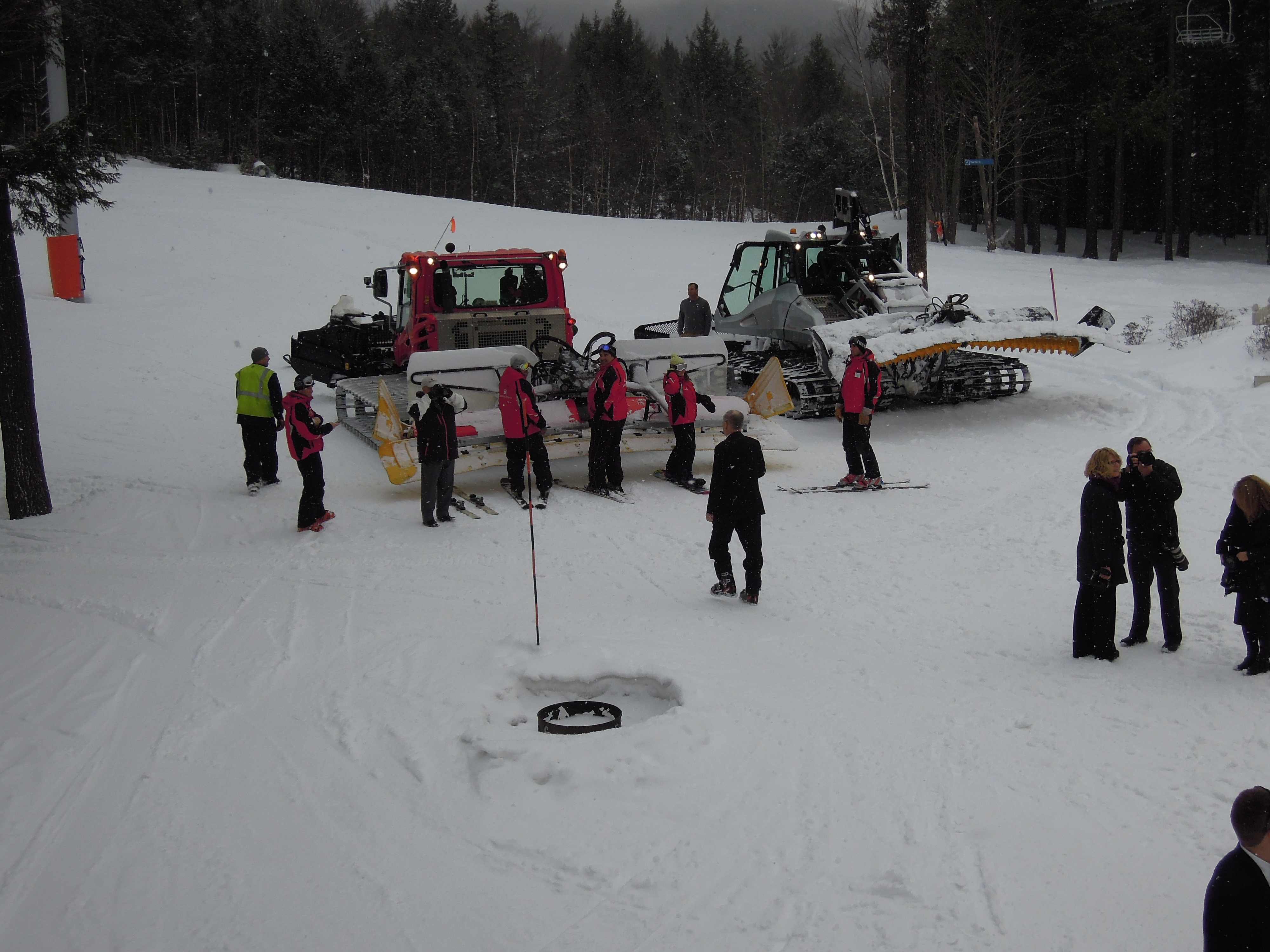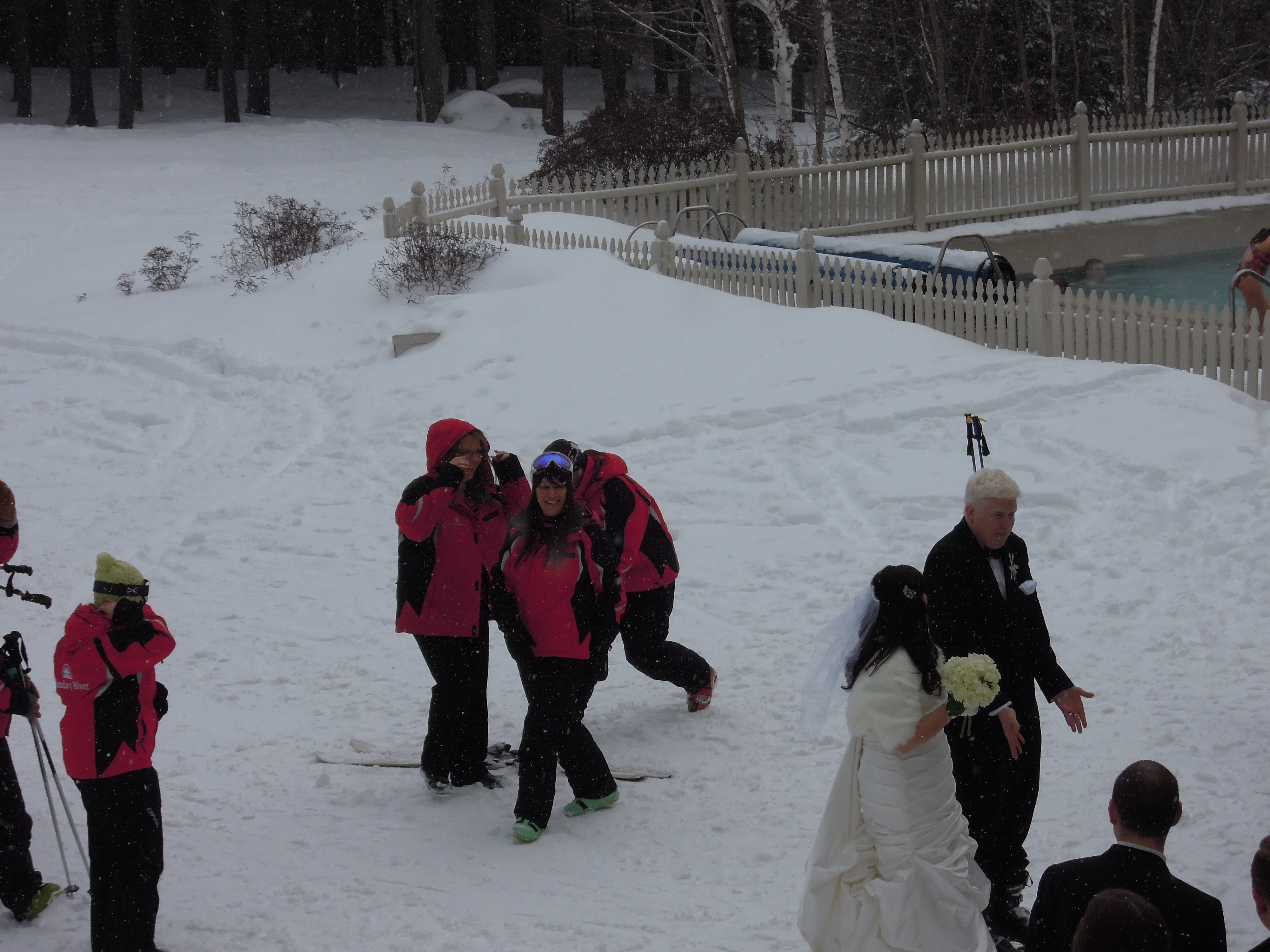 After the vows were exchanged at the church, we returned to the hotel where the couple did a ski entrance outside in their wedding clothes. It was so cute and impressive that the bride did this in her wedding gown!