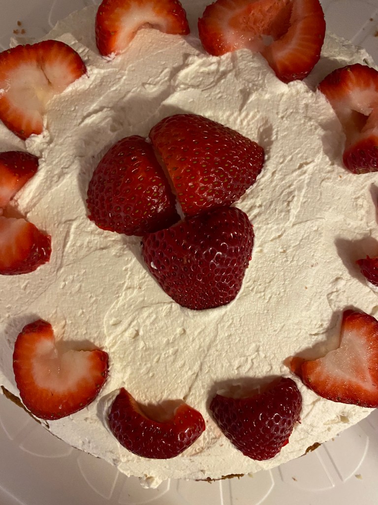 This was the perfect Memorial Day Weekend treat. I think it would be lovely to make anytime Strawberries are in Season. You can probably even add some of those fun, long celebration candles in blue to make it a festive treat for the 4th of July. I think adding blueberries to it would overwhelm it, but wouldn’t be bad. Just not exactly what I’m looking for when eating this dessert. The cake fed 5 adults and 2 toddlers with very little leftover. I highly suggest adding this to your Summer baking list before it gets too hot to be in the kitchen. The great thing about this is that the cake can be made ahead of time and frozen so you could bake it now and save it for a hot Summer day without having to turn on the stove! This was a real crowd pleaser and I’m sure I’ll make it again this Summer to share with family. I think it’s very important to use high quality Strawberries when making this or else it probably won’t taste as good. I hope you’re able to enjoy this too!