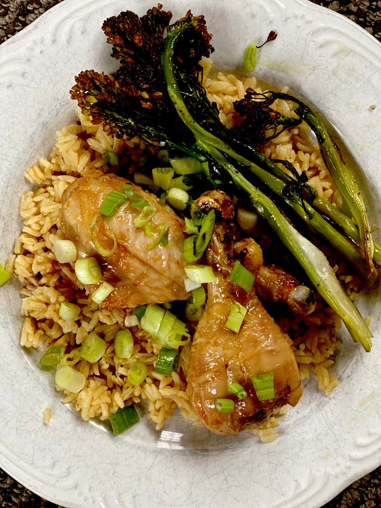 These drumsticks pair perfectly with Jasmine rice and roasted broccolini or broccoli. For the Jasmine rice, I followed the instructions on the package and subbed in vegetable broth for water when cooking. Water, veggie stock, or chicken broth/stock would work well too.
