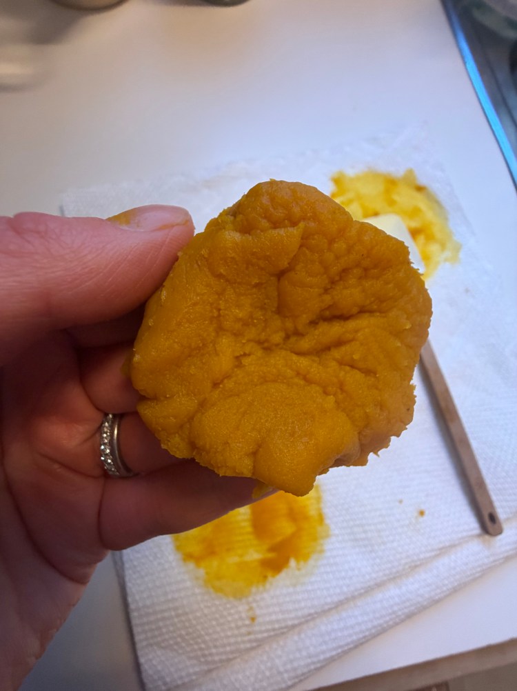 Remove the moisture from the pumpkin puree. Place the puree between two paper towels pressed down to soak up the moisture. Continue until most of the moisture has been removed and the puree has an almost dough like consistency. *